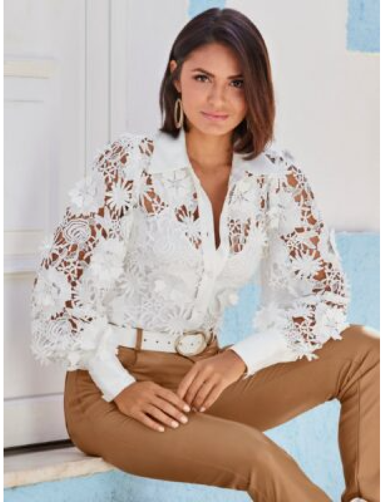 3D Floral Lace Victoria Chic Drama Sleeve Shirt White
