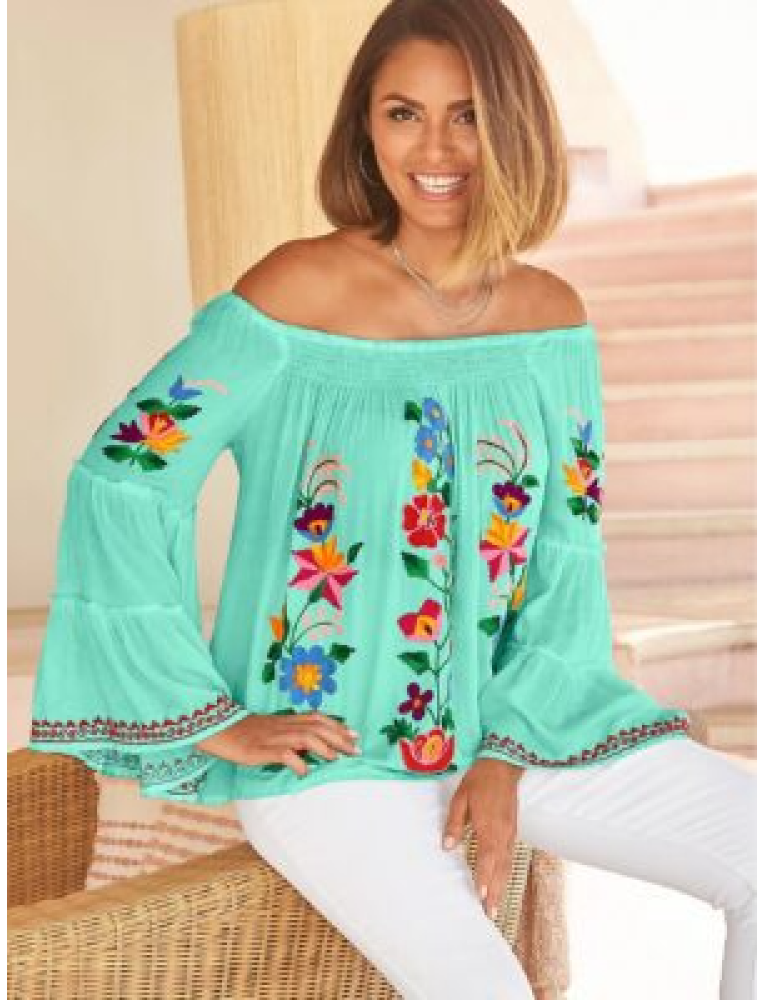 Bright Floral Embroidered Tiered Sleeve Off The Shoulder Blouse Mint Multi